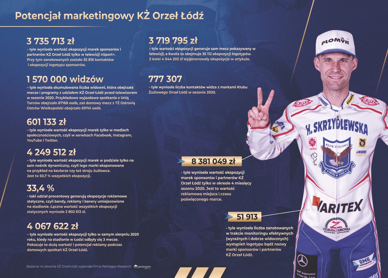 Badanie na zlecenie KŻ Orzeł Łódź wykonała firma Pentagon Research specjalizująca się w badaniach z zakresu marketingu sportowego oraz efektywności sponsoringu sportu. Okres analizy to cztery miesiące trwania sezonu eWinner 1. Ligi w 2020 roku. W trakcie rozgrywek eWinner 1. Ligi klub uzyskał 8,4 mln zł wartości mediowej dla sponsorów i partnerów współpracujących z Klubem oraz marek własnych. Na kwotę tę składa się aż 52 tys. ekspozycji.