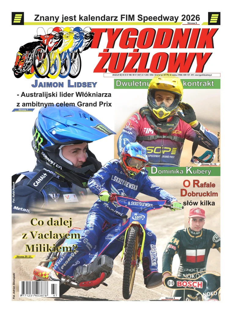 Ponadto: Co dalej z Vaclavem Milikiem? – o tym sam zainteresowany; Tomasz GAPIŃSKI; „Bartosz BAŃBOR „Polscy młodzieżowcy sobie poradzą”; Matic IVACIC „Wątpię, żebym tam dalej jeździł”; Oskar POLIS „Wszędzie dobrze, gdzie nas nie ma”; Kalendarz FIM Speedway 2026; Aleksander JANAS „Trochę czasu od rozstania z Falubazem upłynęło; Zbigniew LECH „Nie majstrować ze składem”; Jaimon LIDSEY – australijski lider Włókniarza z ambitnym celem GP; Dwuletni kontrakt Dominika Kubery.