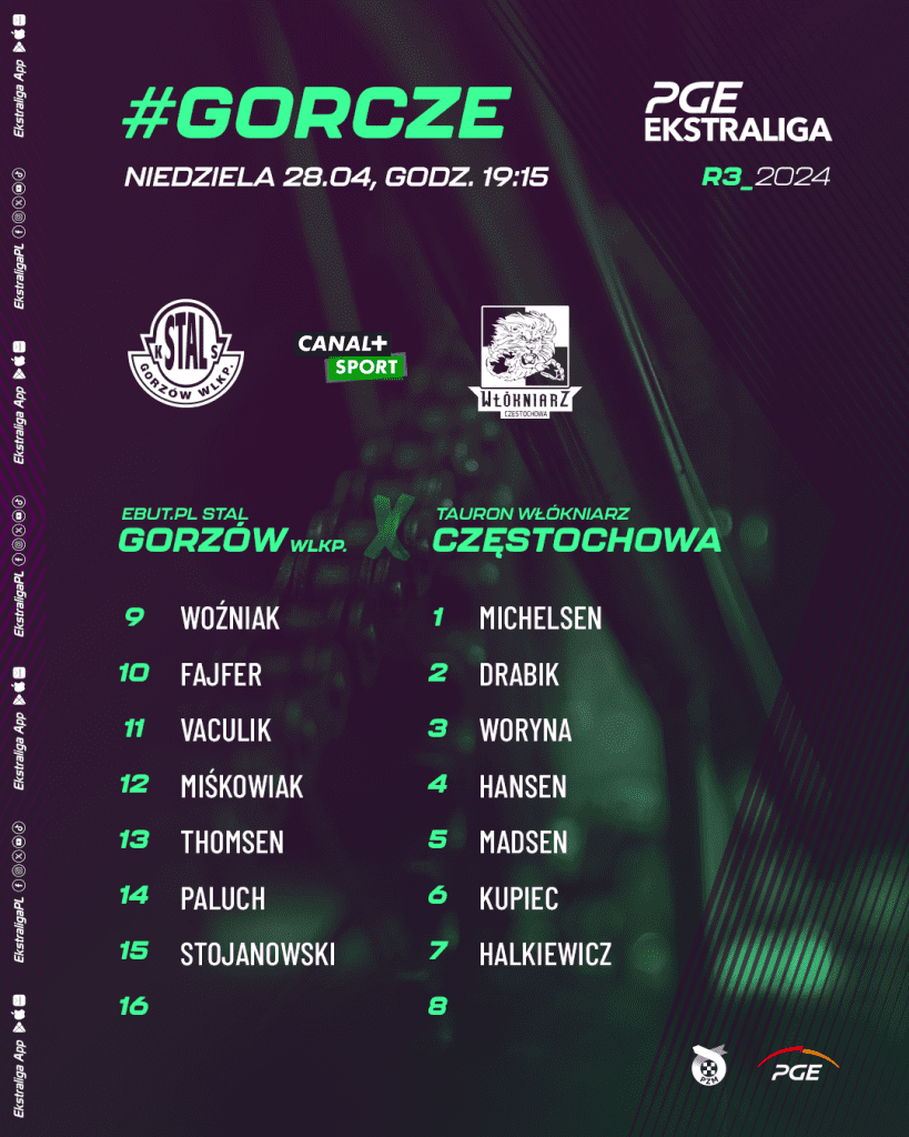 Mecz 3. kolejki PGE Ekstraligi pomiędzy ebut.pl Stalą Gorzów Wlkp. a Krono-Plast Włókniarzem Częstochowa rozpocznie się w niedzielę 28.04 o godzinie 19:15. Transmisję z tego spotkania przeprowadzi Canal+ Sport.