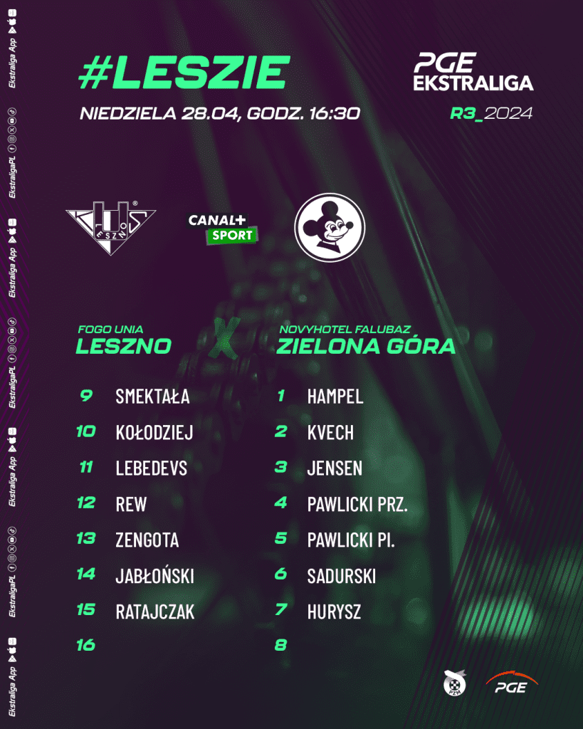 Mecz Fogo Unii Leszno z NovyHotel Falubazem Zielona Góra rozpocznie się w niedzielę 28.04 o godzinie 16:30. Transmisję z tego spotkania przeprowadzi Canal+ Sport.