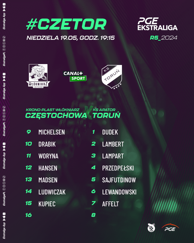Mecz Krono-Plast Włókniarz Częstochowa – KS Apator Toruń rozpocznie się w niedzielę 19 maja o godzinie 19:15. Transmisję z tego spotkania przeprowadzi Canal+Sport.