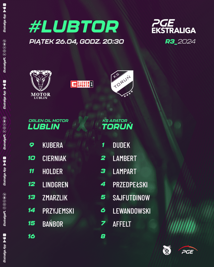 Mecz PGE Ekstraligi pomiędzy Orlen Oil Motorem Lublin oraz KS Apatorem Toruń rozpocznie się w piątek 26 kwietnia o godzinie 20:30. Transmisję z tego spotkania przeprowadzi Eleven Sports.