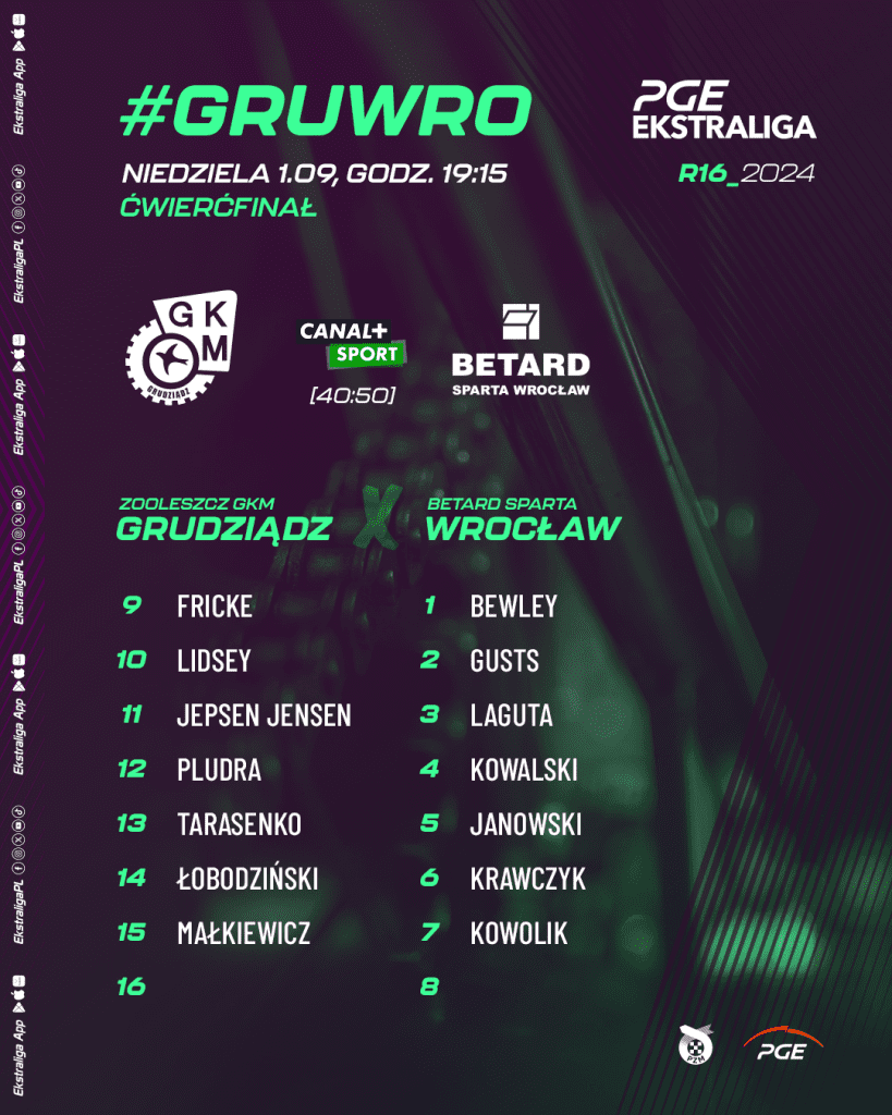 W niedzielę 1 września rozegrane zostaną rewanżowe spotkania w fazie ćwierćfinałowej play-off PGE Ekstraligi. Jednym z nich będzie starcie ZOOleszcz GKM-u Grudziądz z Betard Spartą Wrocław.