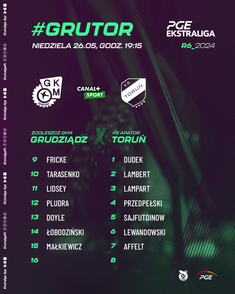 Mecz ZOOleszcz GKM Grudziądz vs. KS Apator Toruń rozpocznie się w niedzielę 26 maja o godzinie 19:15. Transmisję z tego spotkania przeprowadzi Canal+Sport.