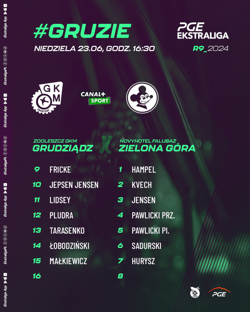 Mecz ZOOleszcz GKM Grudziądz vs. NovyHotel Falubaz Zielona Góra rozpocznie się w niedzielę 23 czerwca o godzinie 16:30. Transmisję z tego starcia przeprowadzi Canal+Sport.